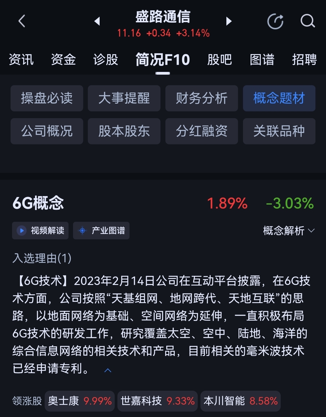 $盛路通信(SZ002446)$ 盛路通信【6G技术】2023年2月14日公司在互动平台披露,在6G技术方面,公司按照"天基组网、地网跨代、天地互联"的思路,以地面网络为基础、空间网络为延伸,一直积极布局6G技术的研发工作,研究覆盖太空、空中、陆地、海洋的综合信息网络的相关技术和产品,目前相关的毫米波技术已经申请专利。