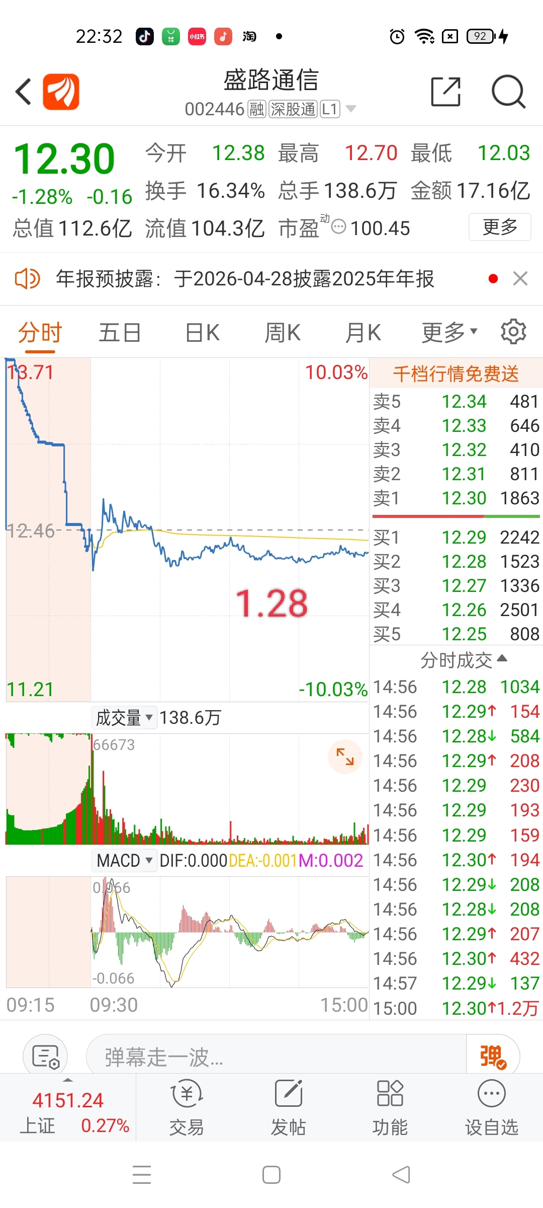 $盛路通信(SZ002446)$ 竞价走弱,庄家整天对倒,这种走势看不明白,多半为回调磨盘走势