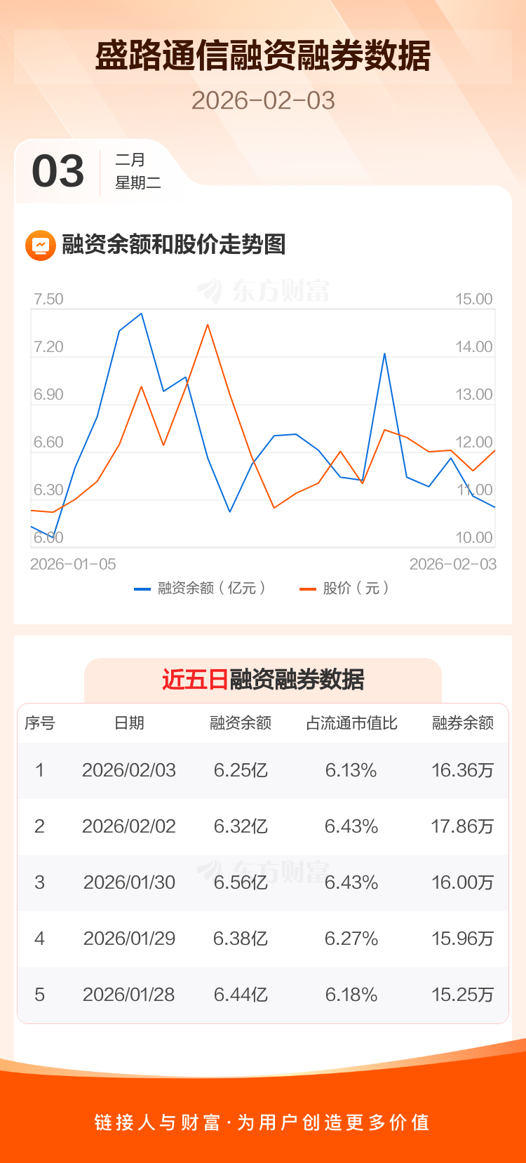 交易所最新数据显示,盛路通信于2026年2月3日获融资买入7327.46万元,融资偿还8020.78万元,当日融资净偿还693.32万元。目前,该股融资余额6.25亿,占流通市值比例为6.13%。