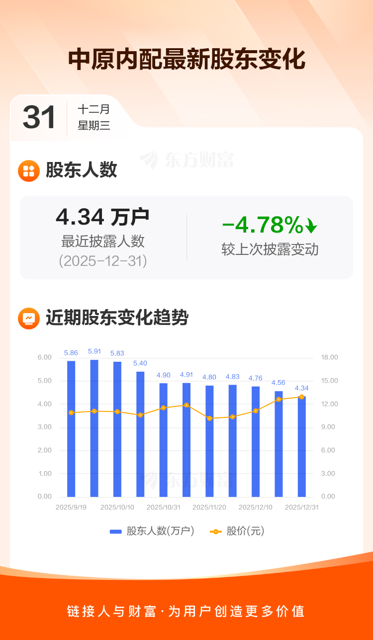 中原内配最新披露数据显示,截至12月31日公司股东户数为4.34万户,较上期(2025年12月19日)减少2178户,降幅为4.78%。户均持有流通股数量由上期的9991股上升至1.05万股,户均持股金额由上期的12.61万元增加至13.57万元。