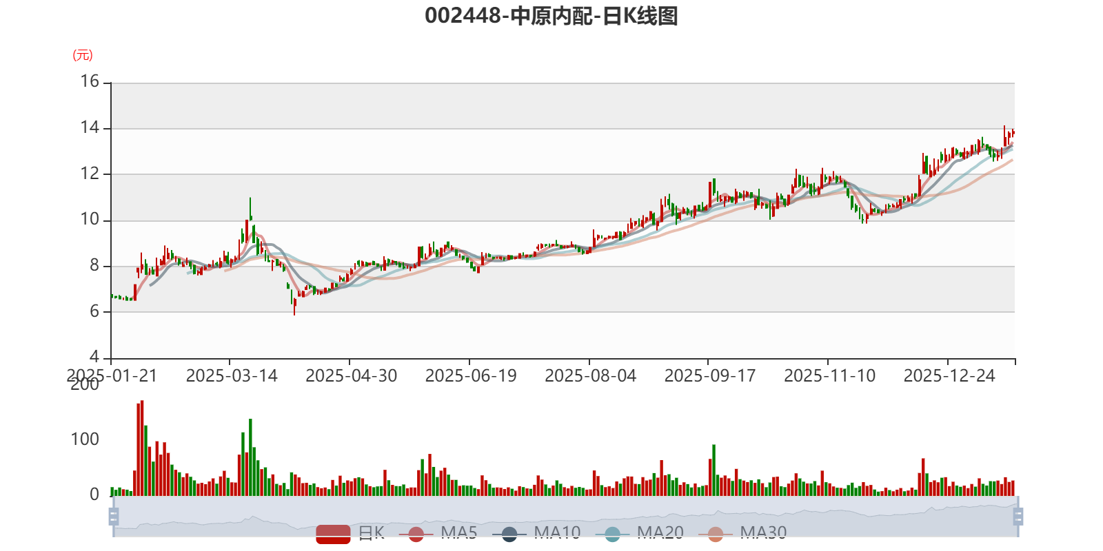 中证智能财讯中原内配(002448)1月20日晚间披露2025年度业绩预告,预计2025年归母净利润3.68亿元至4.28亿元,同比增长80.47%-109.9%;扣非净利润预计3.59亿元至4.19亿元,同比增长87.59%-118.97%;基本每股收益0.63元/股-0.73元/股。以1月20日收盘价计算,中原内配目前市盈率(TTM)约为19.05倍-22.16倍,市净率(LF)约2.19倍,市销率(TTM)约2.2倍。