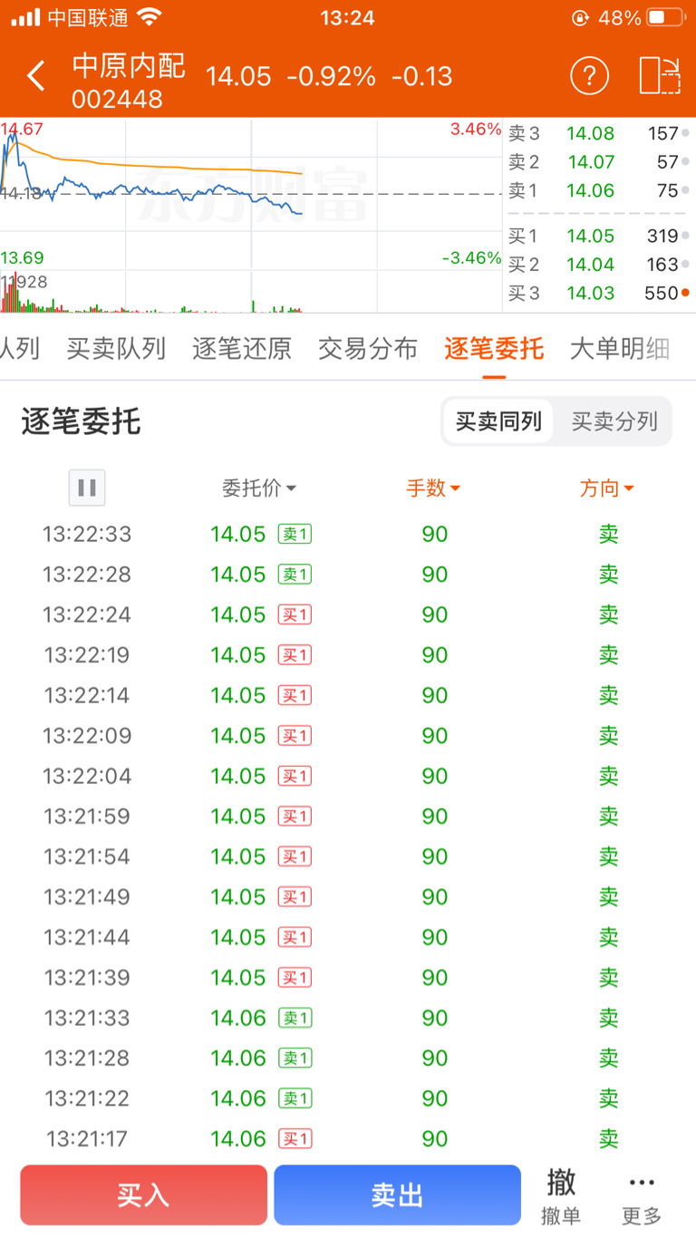 $中原内配(SZ002448)$ 每5秒一个90手连续卖了50个