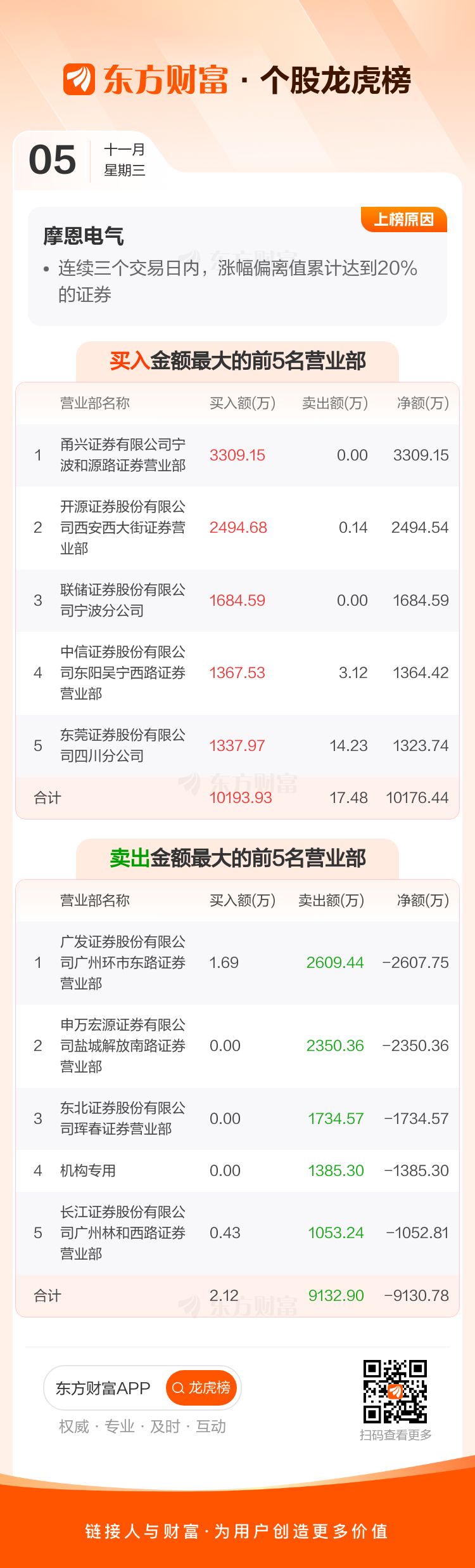 交易所2025年11月5日公布的交易公开信息显示,摩恩电气因成为连续三个交易日内,涨幅偏离值累计达到20%的证券上榜。摩恩电气当日收报8.57元,涨跌幅10.01%,换手率4.89%,成交额1.84亿。异常期间11月4日至11月5日,期间涨幅21.05%,累计偏离值21.95%,区间成交额4.74亿。
