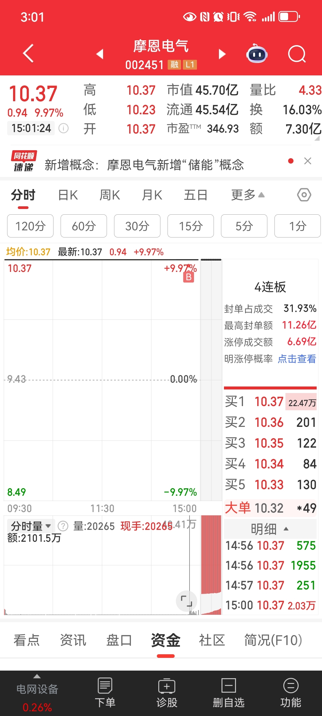 $摩恩电气(SZ002451)$ 10.32买的,如图