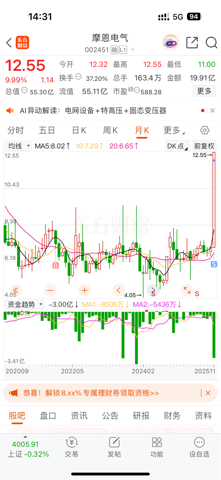 $摩恩电气(SZ002451)$ 留下的发财,我先走了