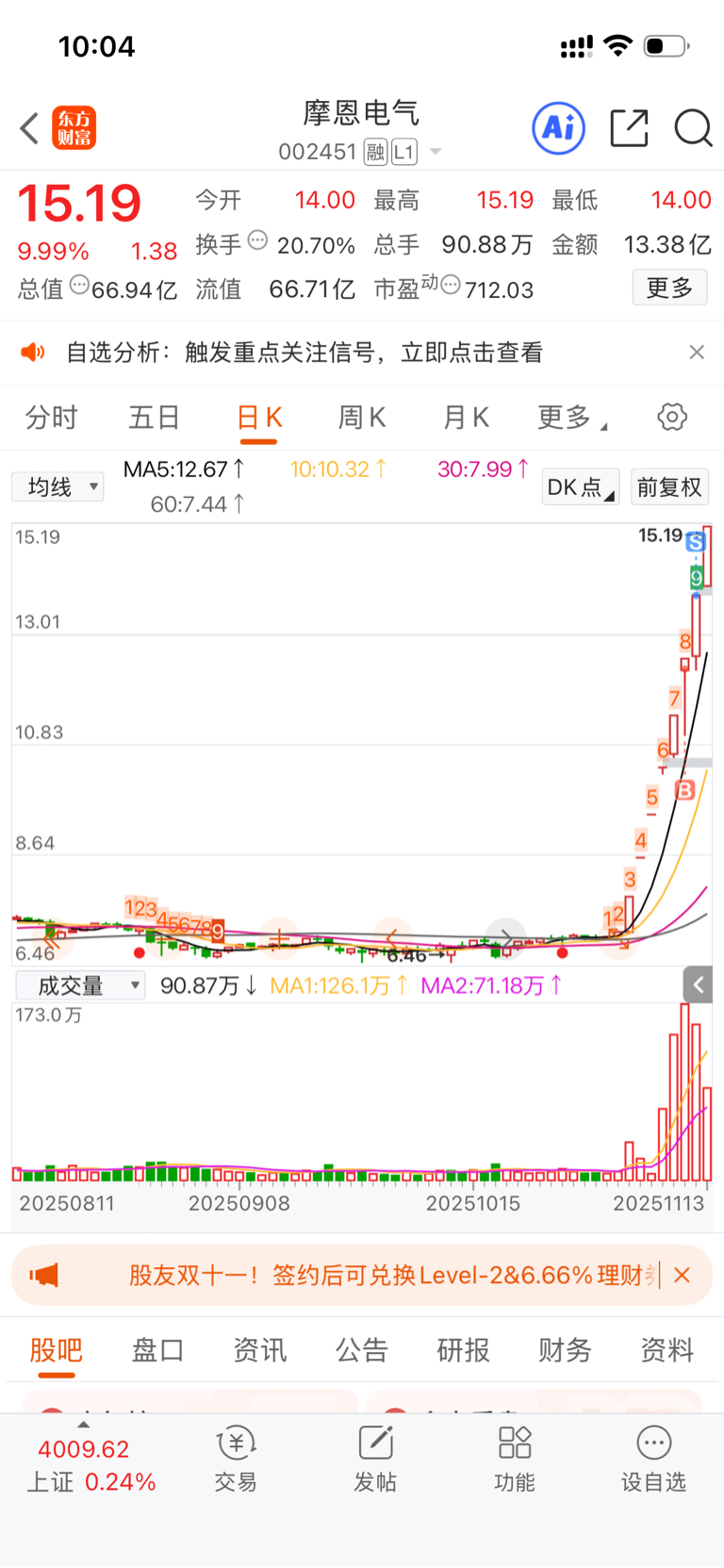 $摩恩电气(SZ002451)$ 遗憾,昨天看封单量比较少就出了