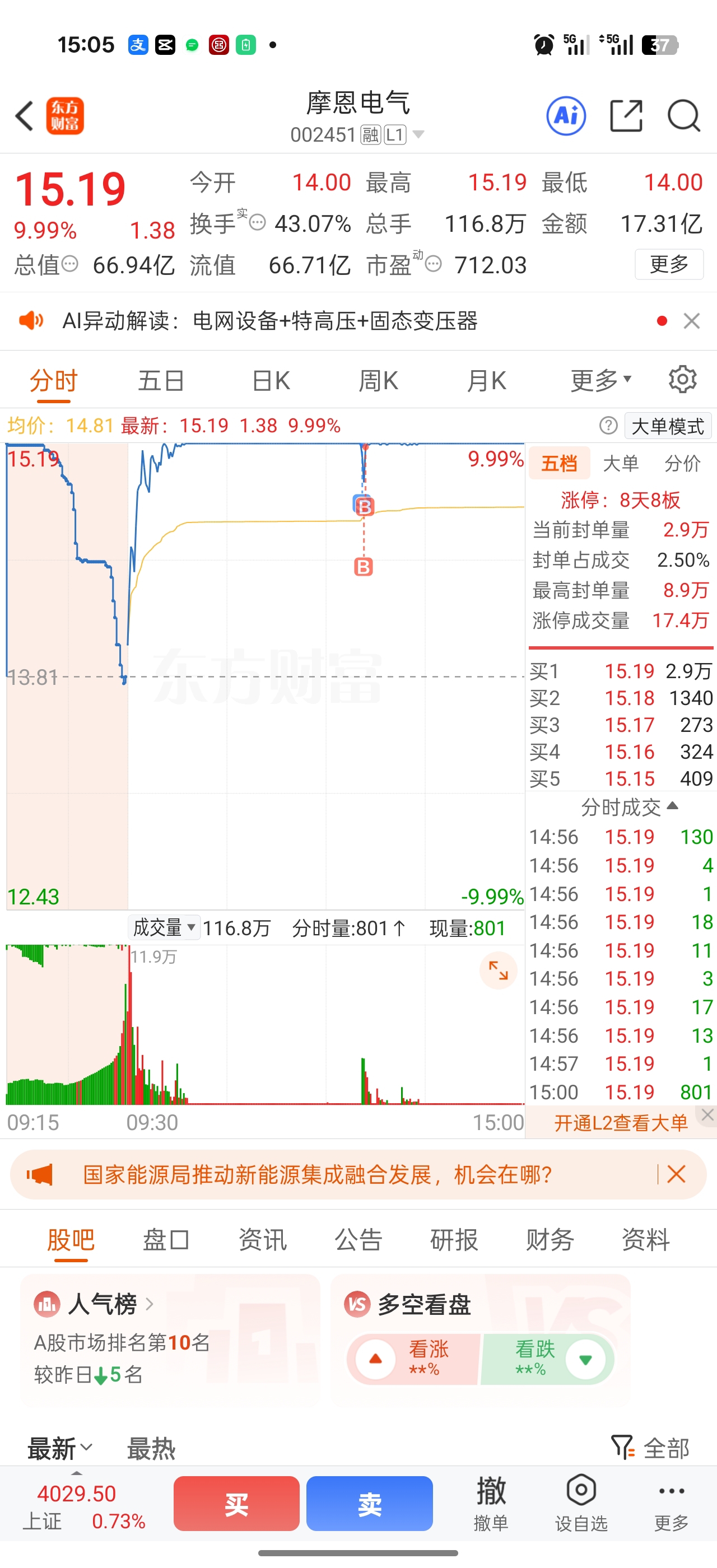 $摩恩电气(SZ002451)$ 开板时满仓卖出,14.75接回半仓,板上买回剩下半仓,依旧满仓