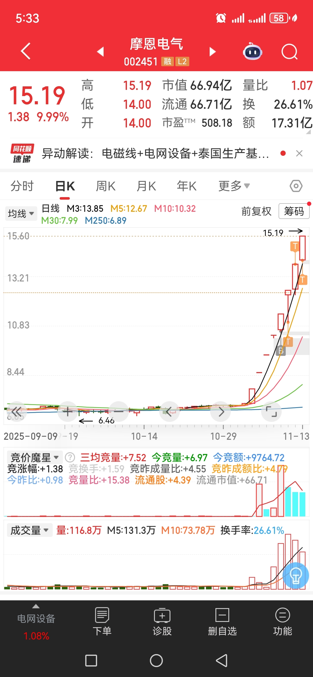 $摩恩电气(SZ002451)$ #收盘点评# #炒股日记# 现在谁都看不起你,都把你当成挡刀小弟,我希望你明天争点气