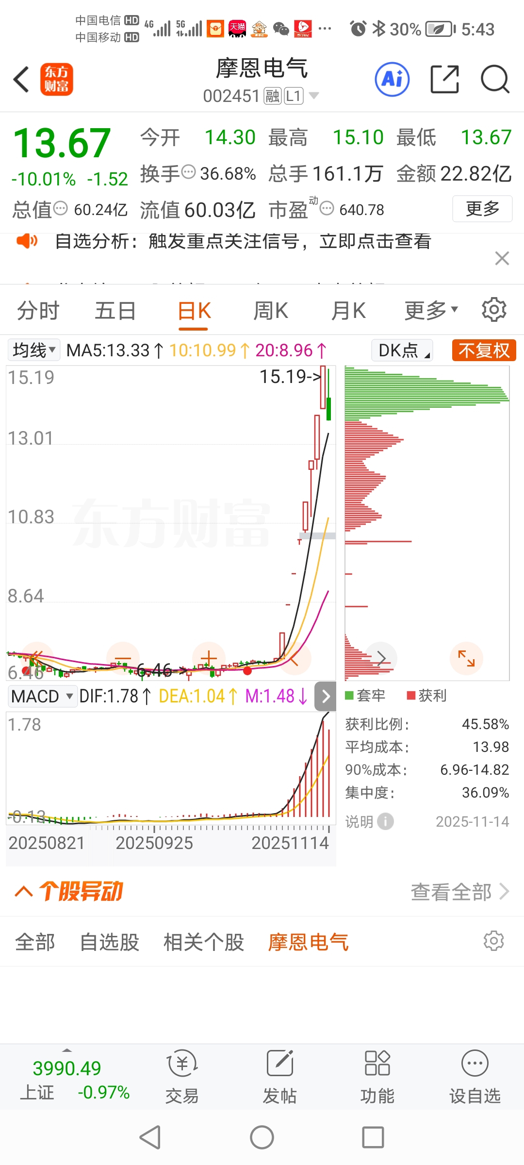 下面的筹码峰动都不动一下,不知道你们在害怕什么,而且才60亿的市值