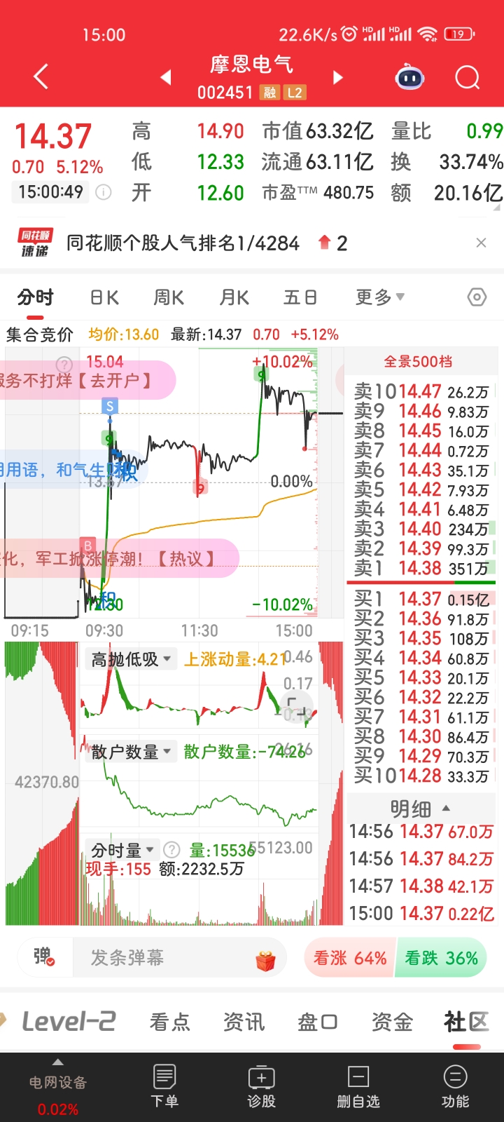 $摩恩电气(SZ002451)$ 周五跌停抄底,结果尾盘跌停,抄底失败,早上开盘怕直接一飞冲天,水下5个来点挂买进,结果少吃了3个点,冲高5个点附近果断卖出,一路震荡没敢买,尾后面拉升又横盘,尾盘看不坚定筹码恐慌出逃,果断接回来了。今天这走势已经是超预期了。继续看涨