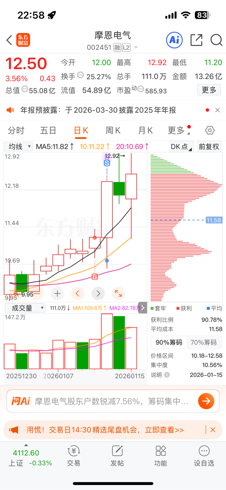 $摩恩电气(SZ002451)$ 现在才发现你起来了,水下负6.5个点一直犹豫买不买回来,最后还是忍住没买,前天水下卖飞,就涨停,这3天亏麻了