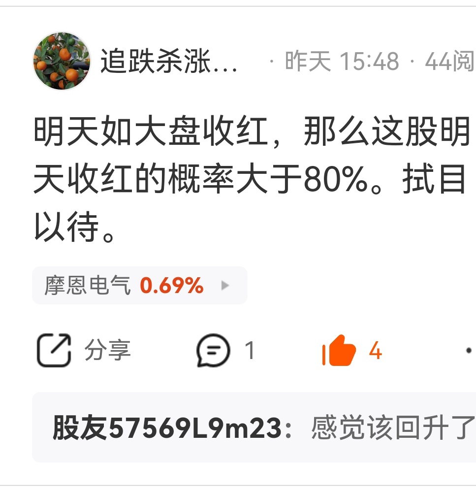 $摩恩电气(SZ002451)$ 在大盘指数极糟的情况下还能红盘收,真是不错了,也验证了昨天我对今天走势的判断。