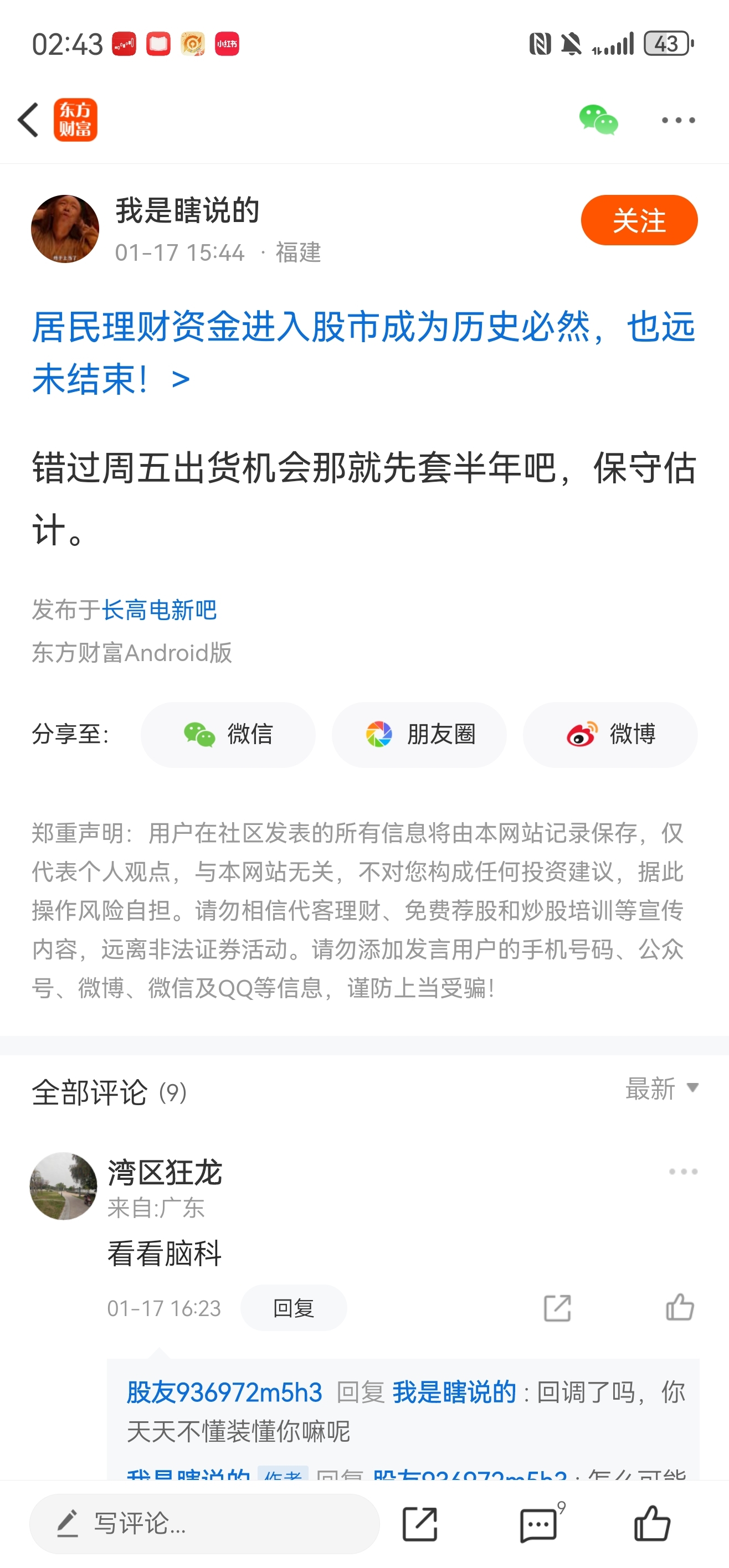 温馨提示: 1.根据《证券法》规定,禁止编造、传播虚假信息或者误导性信息,扰乱证券市场;2.用户在本社区发表的所有资料、言论等仅代表个人观点,与本网站立场无关,不对您构成任何投资建议。用户应基于自己的独立判断,自行决定证券投资并承担相应风险。《东方财富社区管理规定》