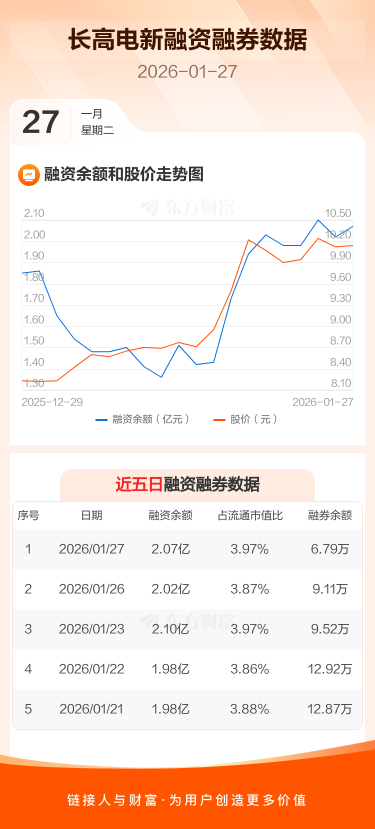 交易所最新数据显示,长高电新于2026年1月27日获融资买入3776.53万元,融资偿还3255.37万元,当日融资净买入521.16万元。目前,该股融资余额2.07亿,占流通市值比例为3.97%。