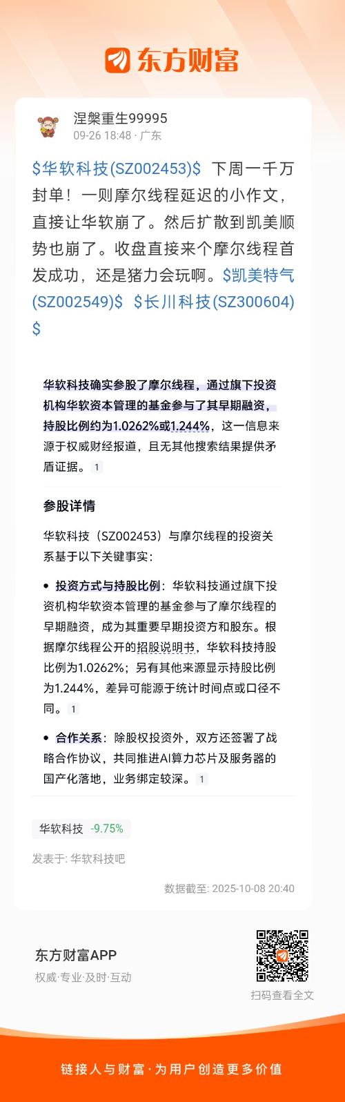 $华软科技(SZ002453)$ 下周一千万封单!一则摩尔线程延迟的小作文,直接让华软崩了。然后扩散到凯美顺势也崩了。收盘直接来个摩尔线程首发成功,还是猪力会玩啊。$凯美特气(SZ002549)$ $长川科技(SZ300604)$