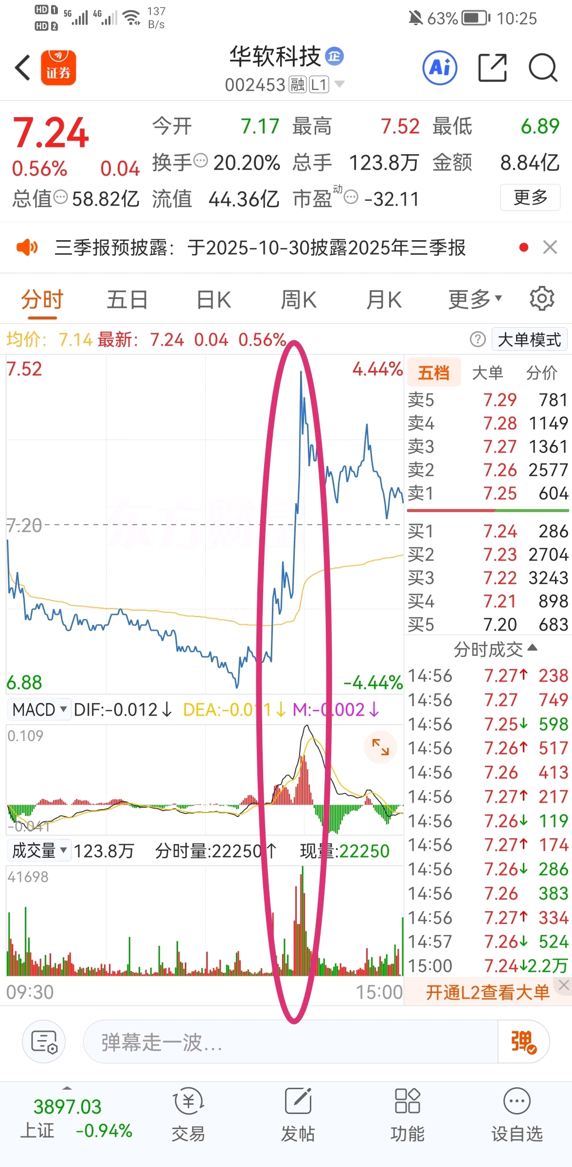 $华软科技(SZ002453)$ 急跌充分调整到位,主力做T资金回补,周一低开是买入机会!