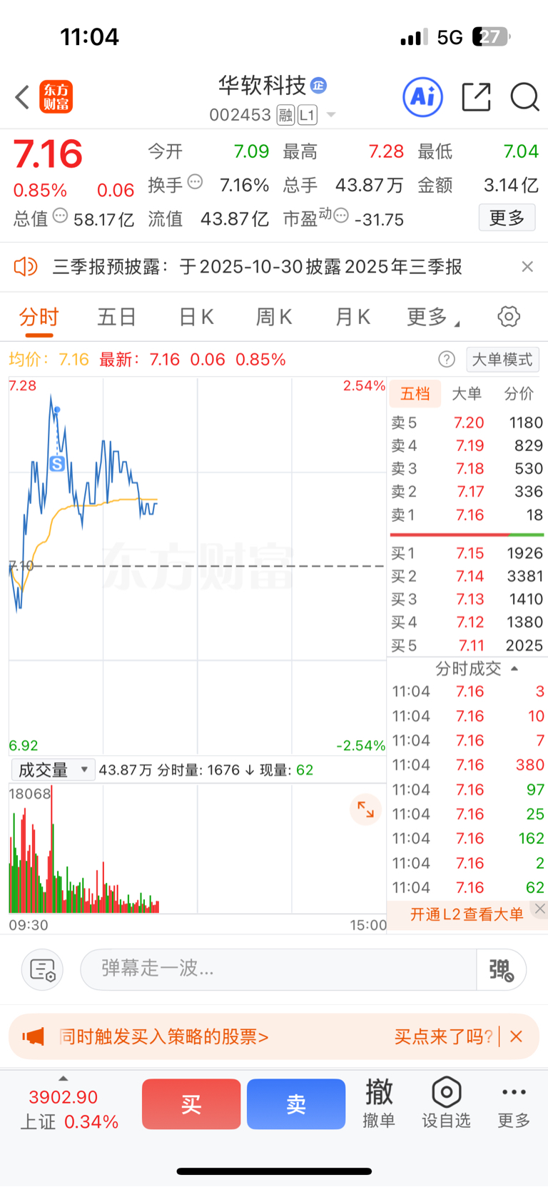 $华软科技(SZ002453)$ 赚了4个点,走了