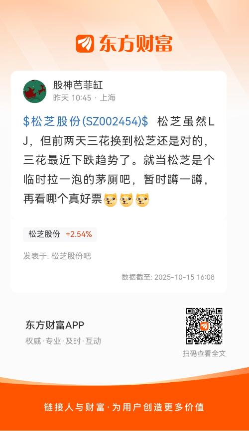$松芝股份(SZ002454)$ 松芝虽然LJ,但前两天三花换到松芝还是对的,三花最近下跌趋势了。就当松芝是个临时拉一泡的茅厕吧,暂时蹲一蹲,再看哪个真好票