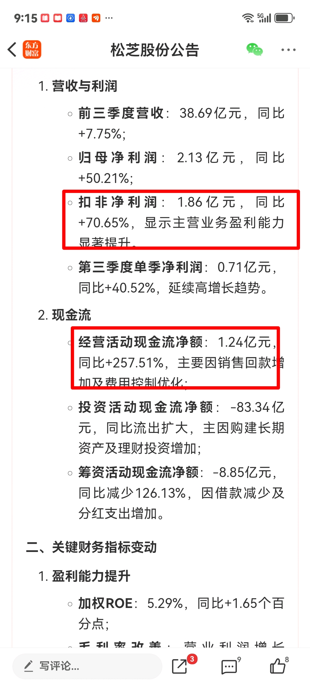 $松芝股份(SZ002454)$ 前三季扣非净利润增长70%,高质量增长,现金分红,未来可期