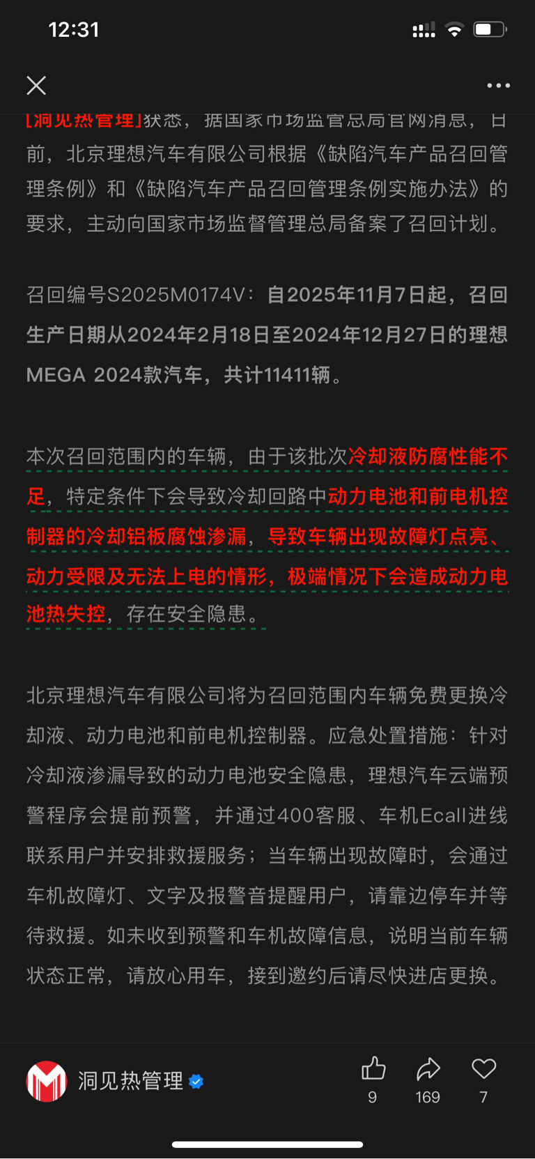 $松芝股份(SZ002454)$ 突发!理想MEGA因热管理问题宣布召回,看出热管理的重要了,用的廉价产品#周末杂谈#