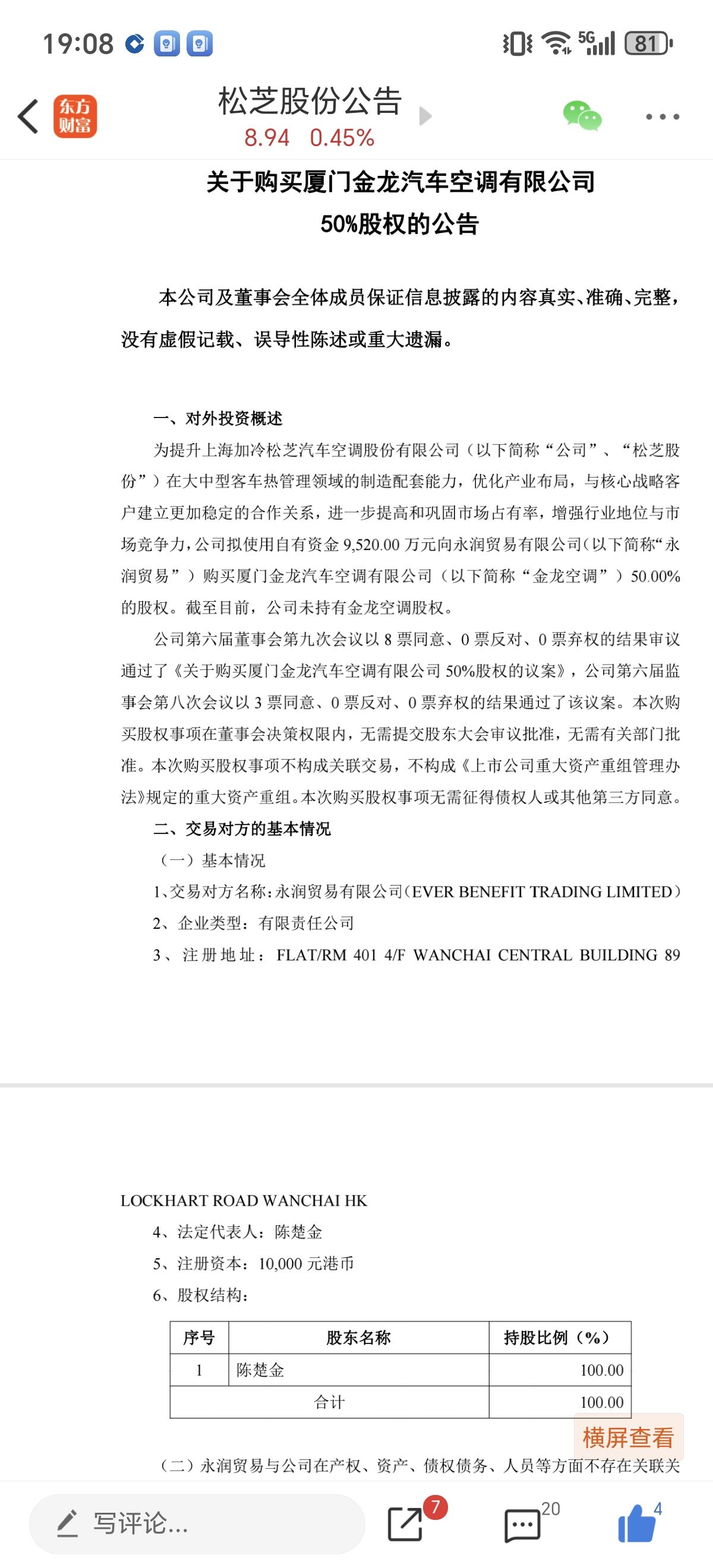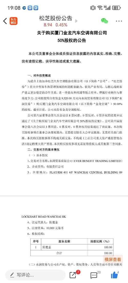 松芝收购金龙空调 正式入主福建板块 结合分红 必将股价二十元!