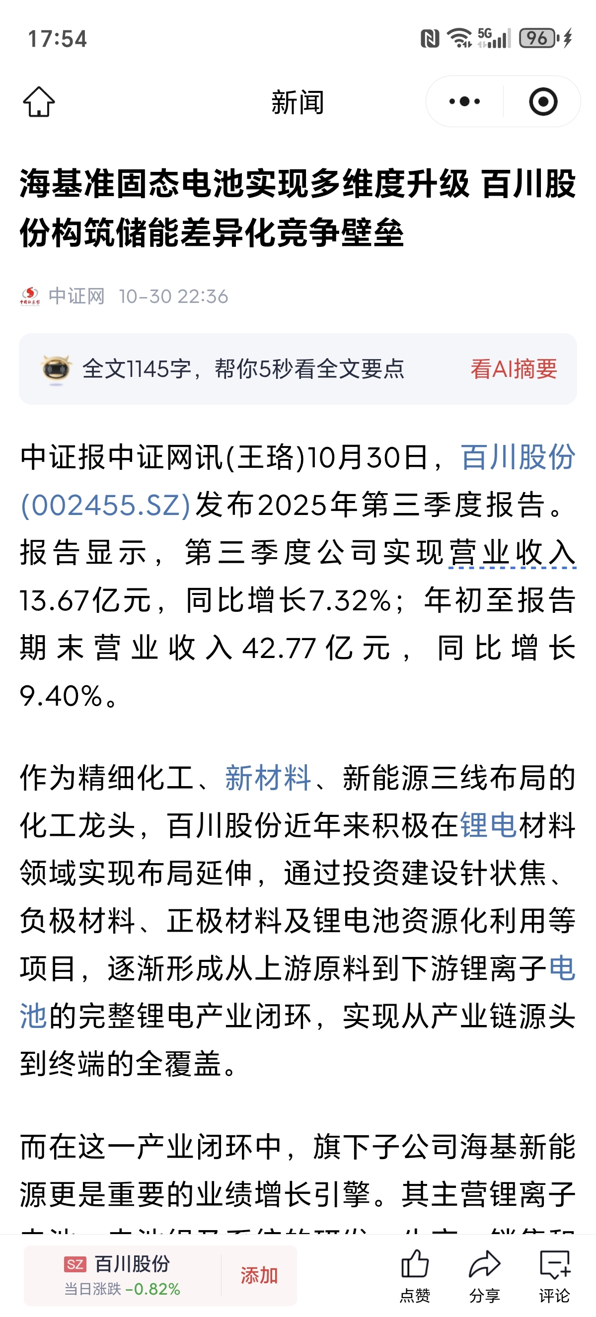 $百川股份(SZ002455)$ 三季报中,储能订单持续增长,存货量稳定增加,再加上最近发布的超性能准固态电池,给了准固态电池商用想象空间。可以作为全固态电池面试之前的过去。全方位来看,有实打实增长,有稳定储能订单流入,更有四季报大空间想象。可以考虑入一点等四季报。