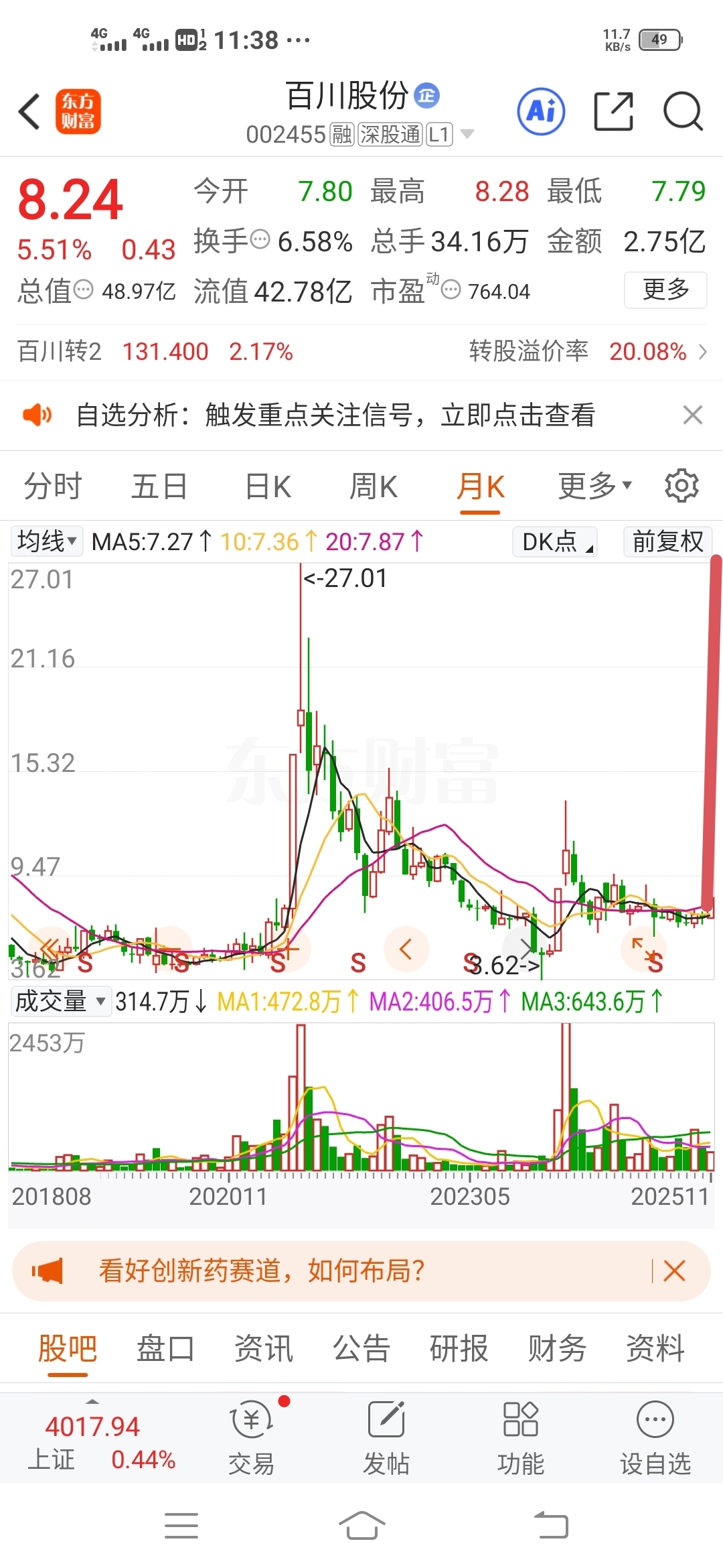 $百川股份(SZ002455)$ 锂电板块是月线级别拉升,这波要破21年27.01高点了,握紧筹码不要被甩下车