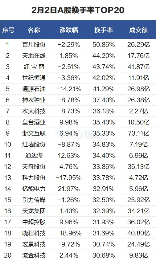 当天换手率最高的个股为百川股份,全天换手率50.86%。天地在线紧随其后,全天换手率44.2%。