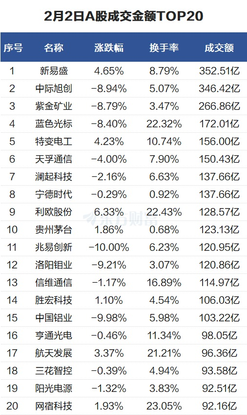 沪深两市成交额2.58万亿元,较上一交易日缩量2508亿元。个股方面,新易盛当日成交352.51亿元。中际旭创当日成交346.42亿元。