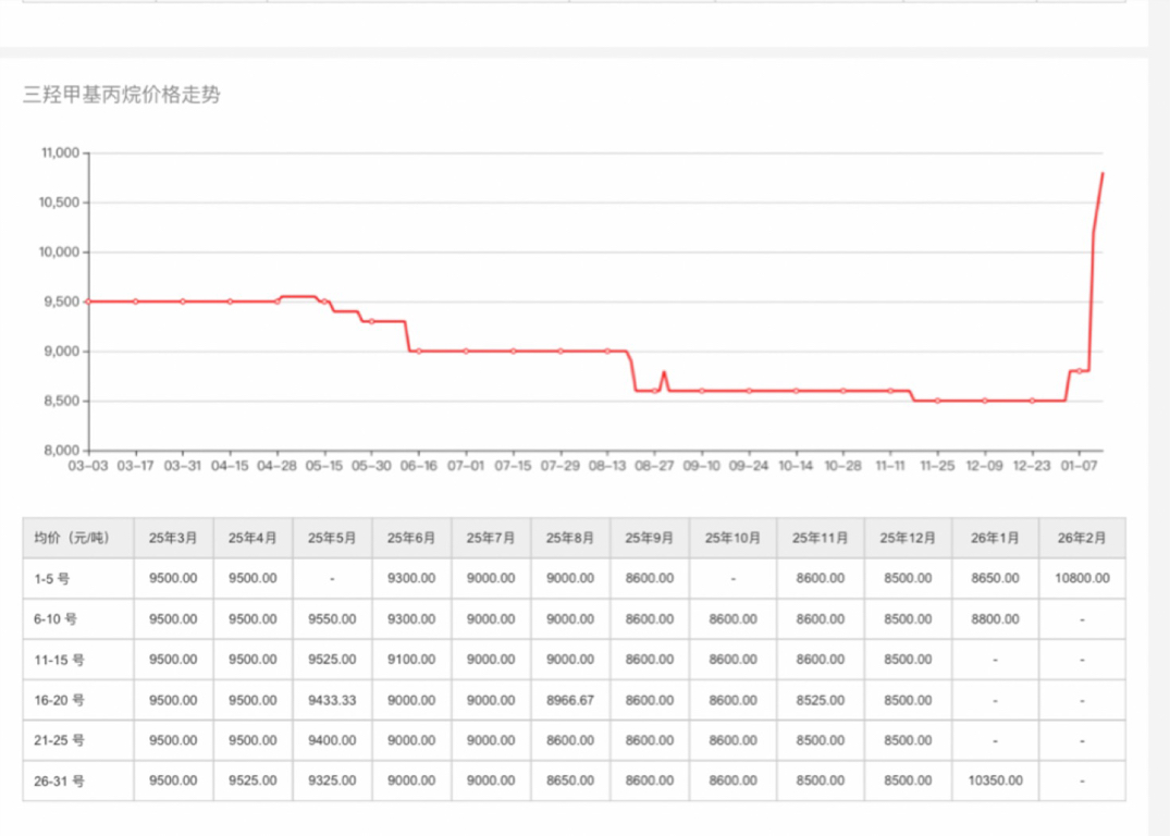 $百川股份(SZ002455)$ 从月初8500,这一周狂涨到10800一吨,一周涨幅27%,已经突破去年最高价格了。什么环氧丙烷都弱爆了,环氧也就前周涨了13%,现在又跌到了8%。看看TMP三羟甲基丙烷才是涨价的王者