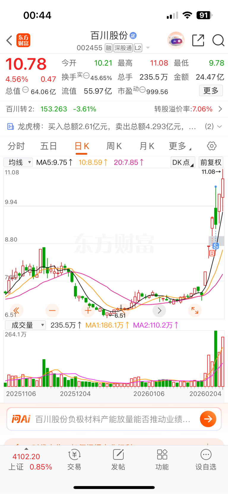 $百川股份(SZ002455)$ 咦,破前高了竟然
