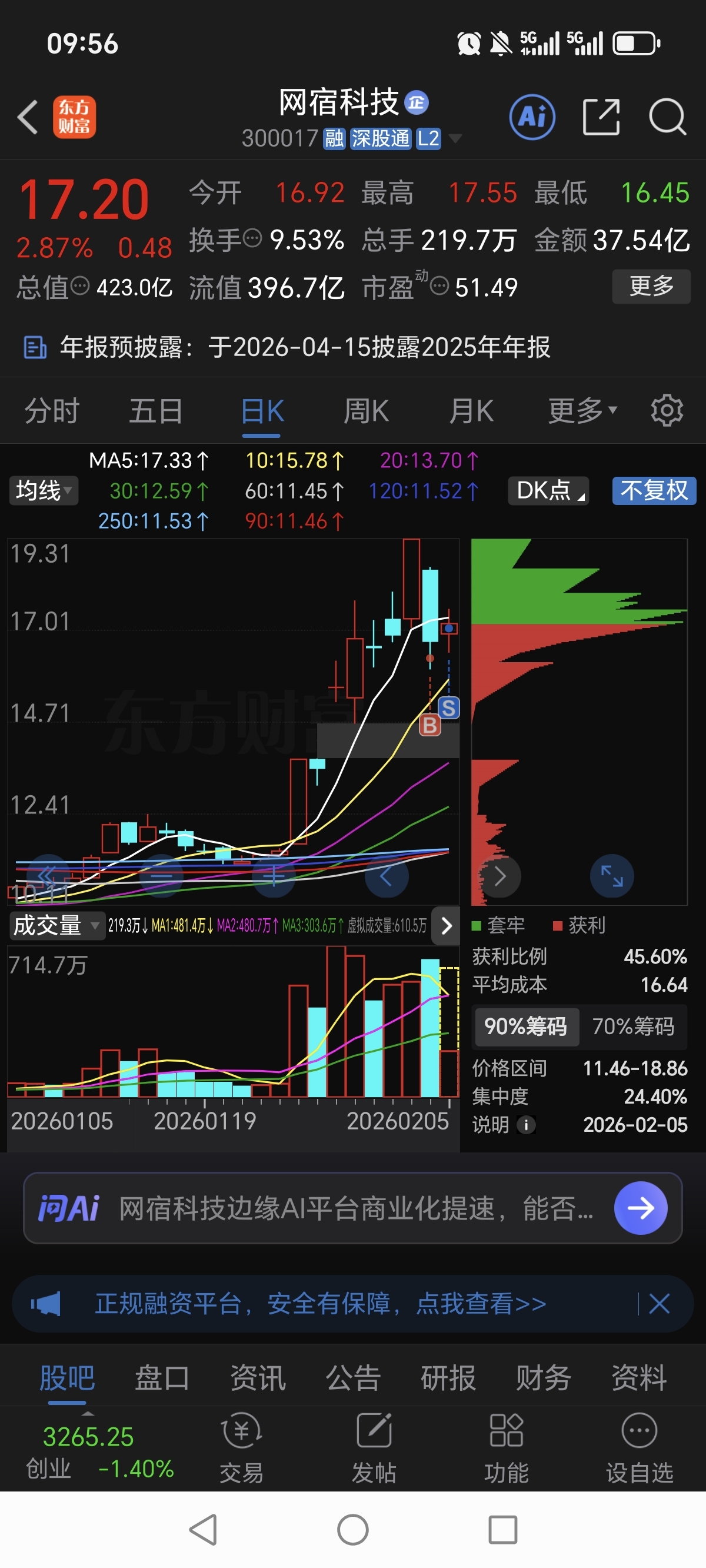 2、昨天16.3抄底的网宿科技,早盘17.06卖飞,落袋4.6%,祝留下的朋友发财