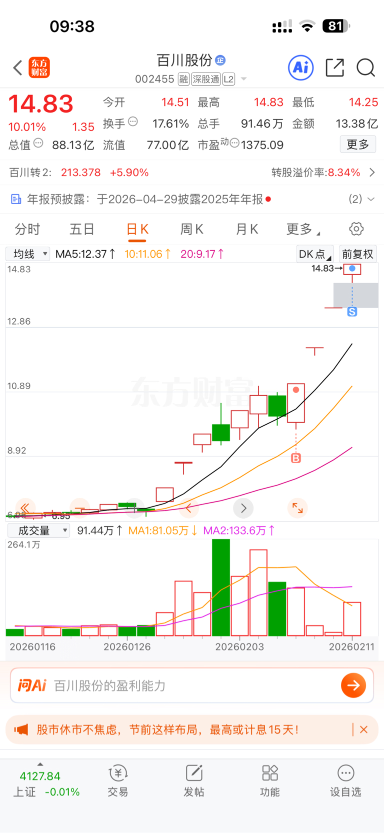 $百川股份(SZ002455)$ 回家过年了,14.7出的,虽然知道今天会板,但是感觉今天出货的概率比较大,应该会拉高出货,兄弟们,最晚明天得出,建议哦