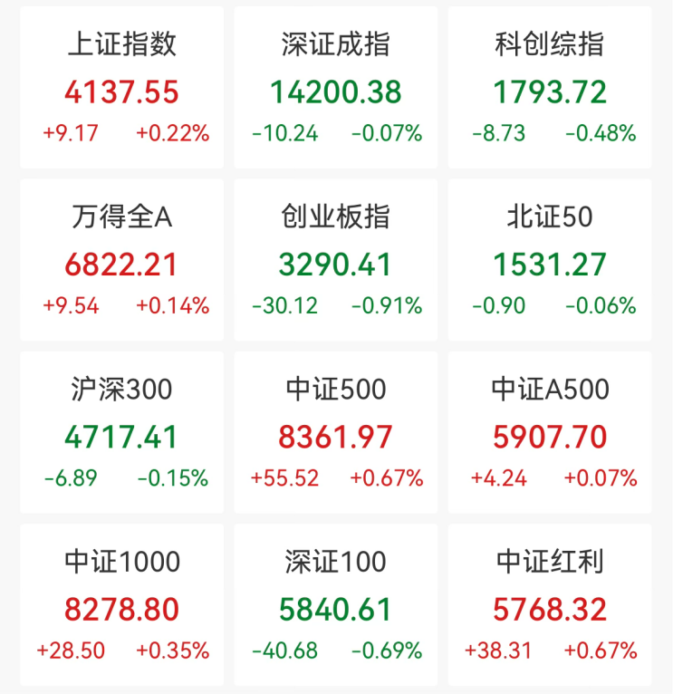 截至午间收盘,沪指报4137.55点,涨0.22%;深证成指微跌0.07%,创业板指跌0.91%,科创综指跌0.48%。
