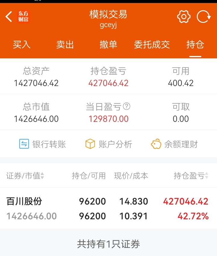 $百川股份(SZ002455)$ 成交量不及前高,是一半吧,不构成卖出条件,这帐户拿4天赢利42%了,大家赏帐户!