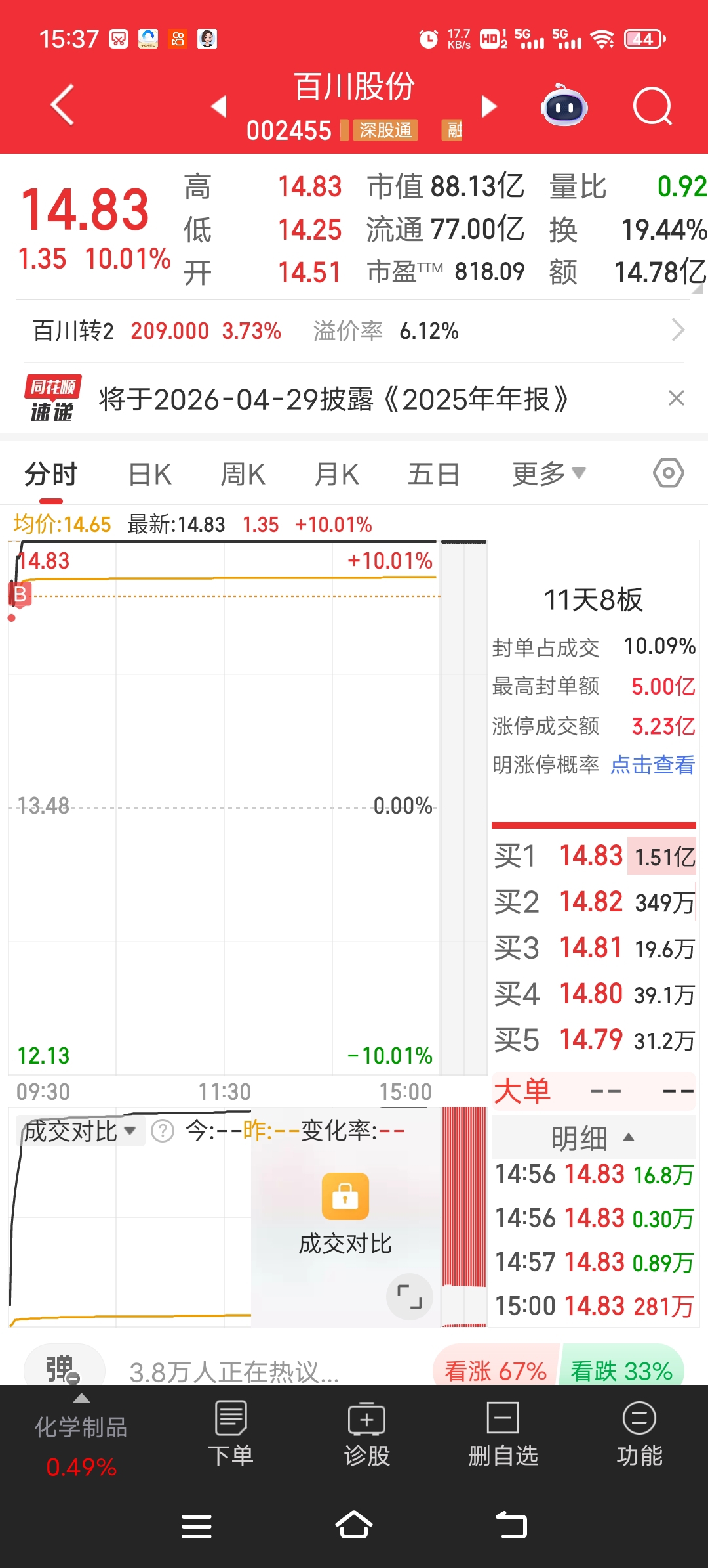 $百川股份(SZ002455)$ 明天不快速上板,立马卖掉,不然该回调了,涨停就格局