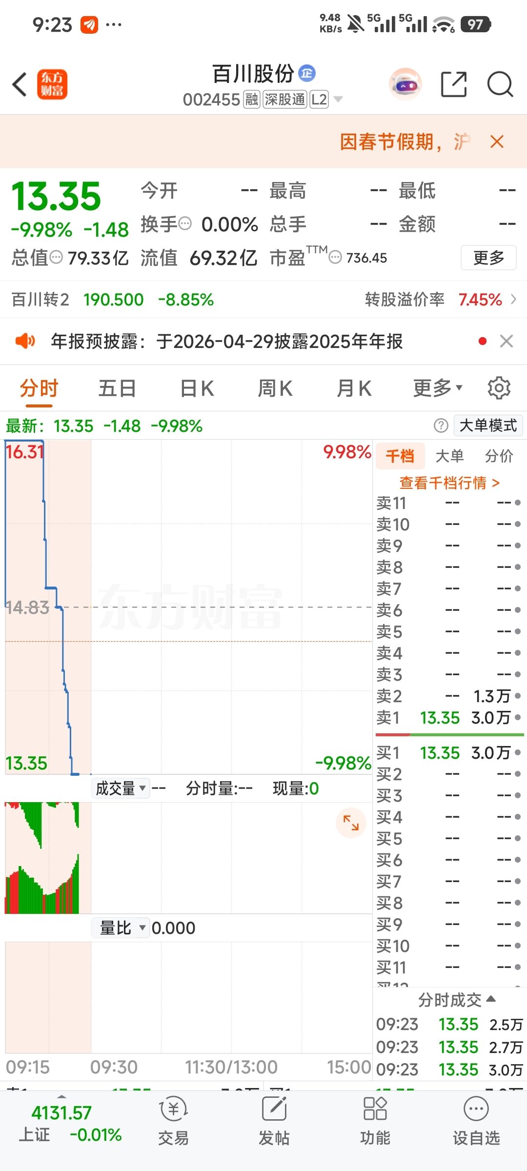 $百川股份(SZ002455)$ 昨天开盘竞价进去,今天直接闷杀,我累了
