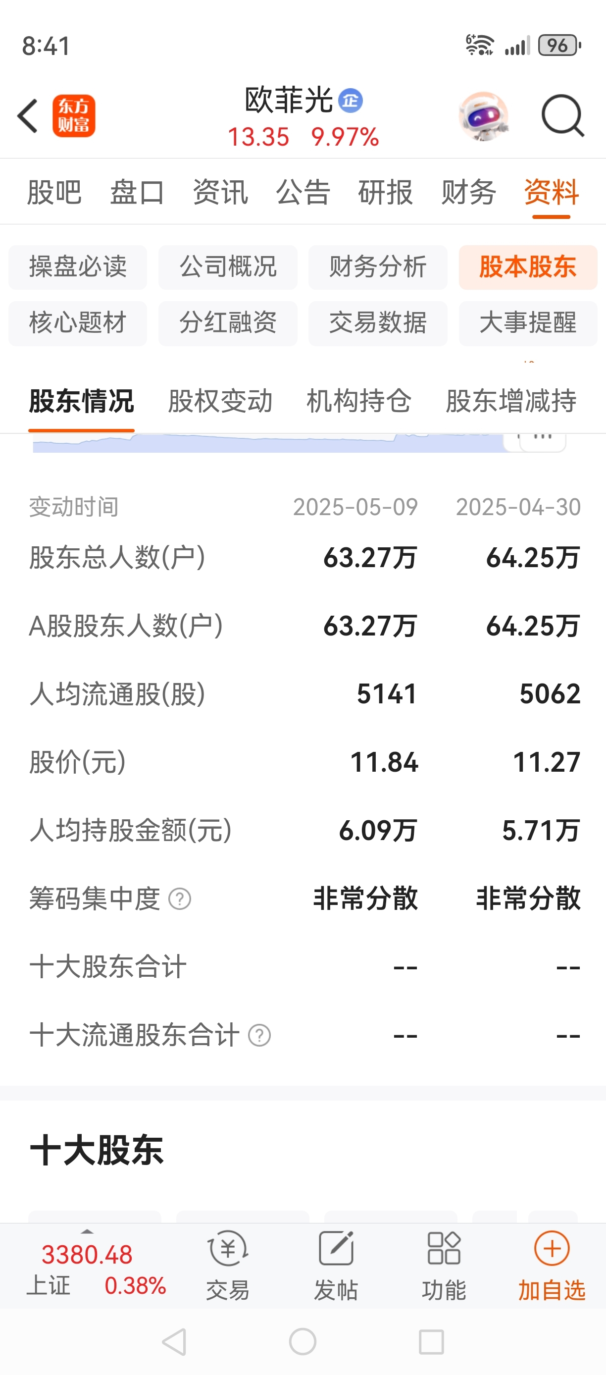 $欧菲光(SZ002456)$ 和长安汽车股东人数出不多