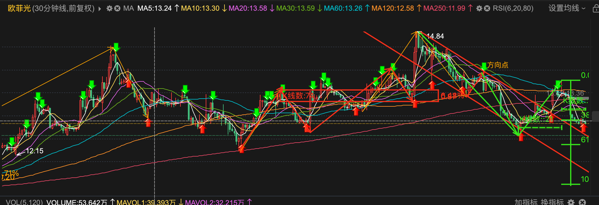 就比如30分钟从14.84—12.58看做一笔那13.78看反弹 结果要看到11.50了,这显然按照当前分析肯定不对的,只有当下创新低反弹不过13.78再创新低才能看到11.50 不知懂可否