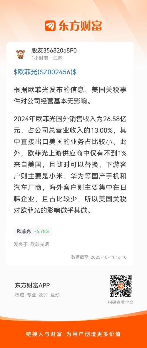 2024年欧菲光国外销售收入为26.58亿元,占公司总营业收入的13.00%,其中直接出口美国的业务占比较小。此外,欧菲光上游供应商中仅有不到1%来自美国,且随时可以替换,下游客户则主要是小米、华为等国产手机和汽车厂商,海外客户则主要集中在日韩企业,且占比较少,所以美国关税对欧菲光的影响微乎其微。