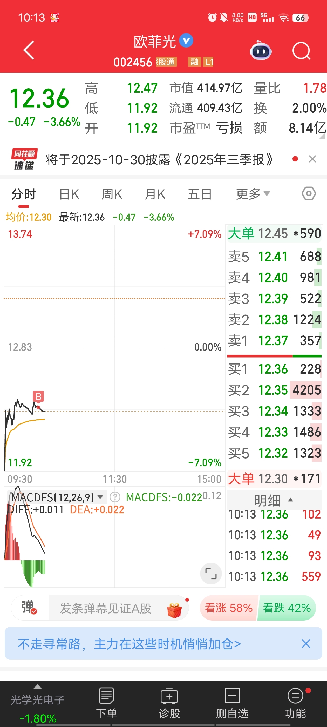 $欧菲光(SZ002456)$ 12.39买了10万,准备躺平了,彻底满仓了,哎。成本补到13.1了。不晓得有没有机会解套
