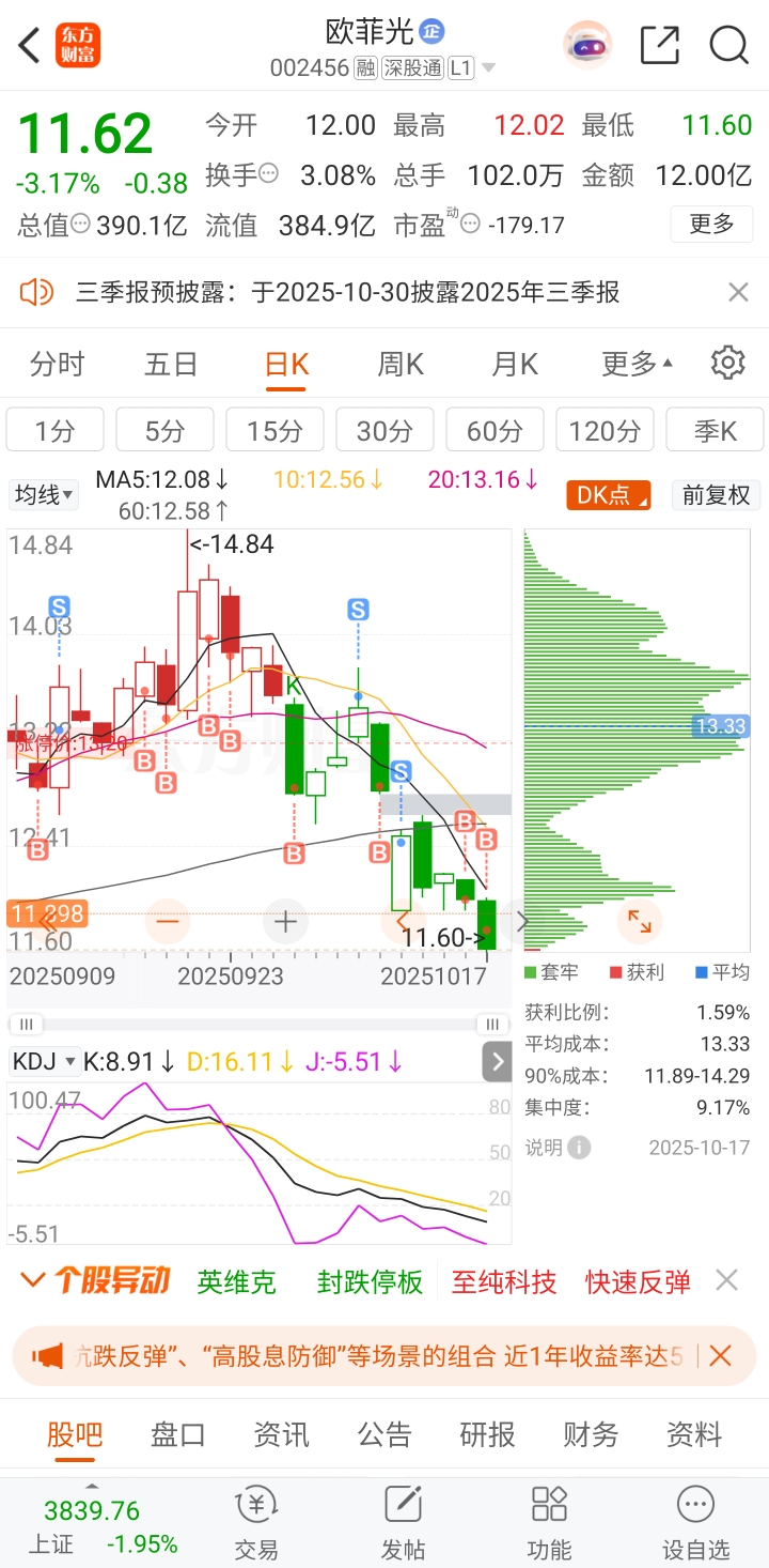 $欧菲光(SZ002456)$ 这个上部筹码峰远高于均价,股票一直下跌,却一直未动。