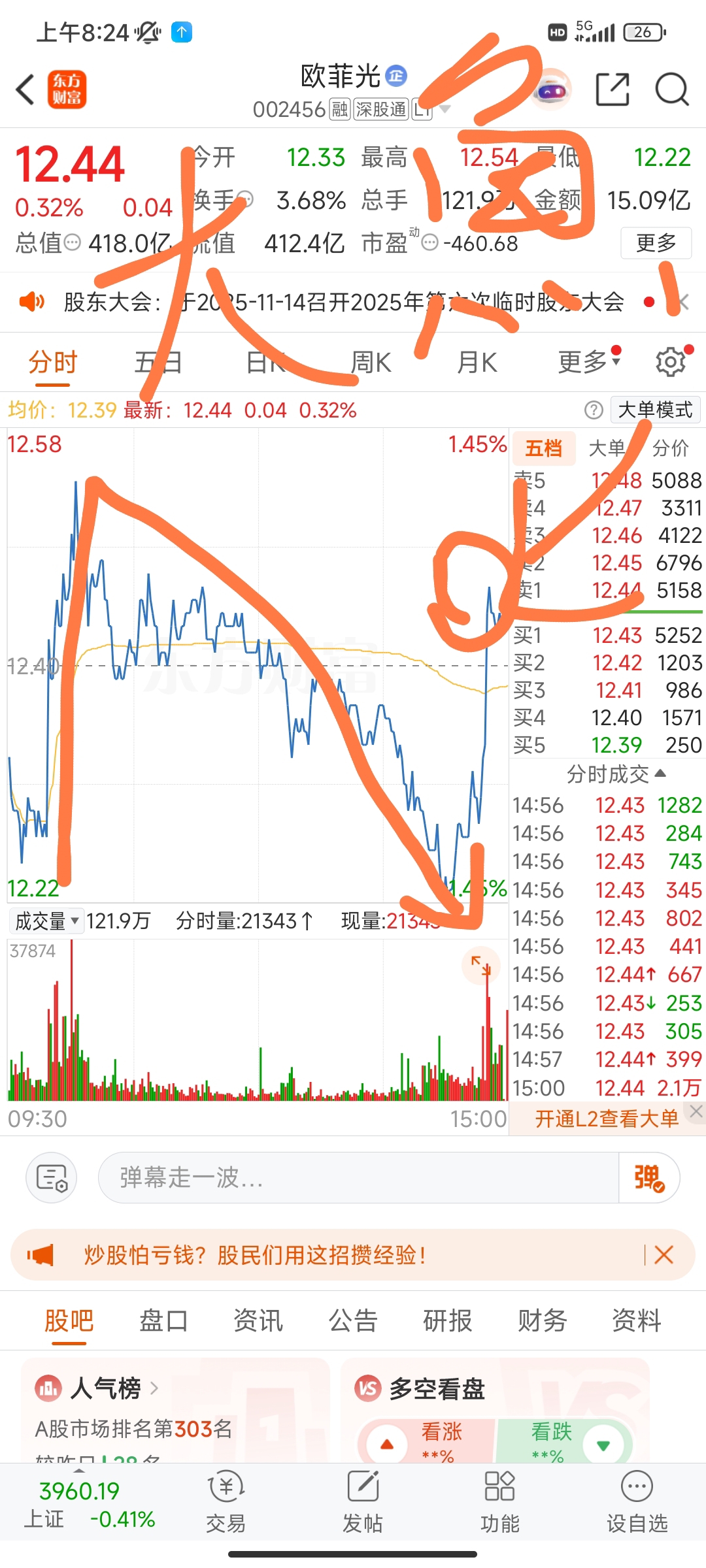 $欧菲光(SZ002456)$ 这种k线形态就是钓鱼线 昨天主力掉到了好多鱼。。今天直接闷杀哈哈哈哈 预测跌停。