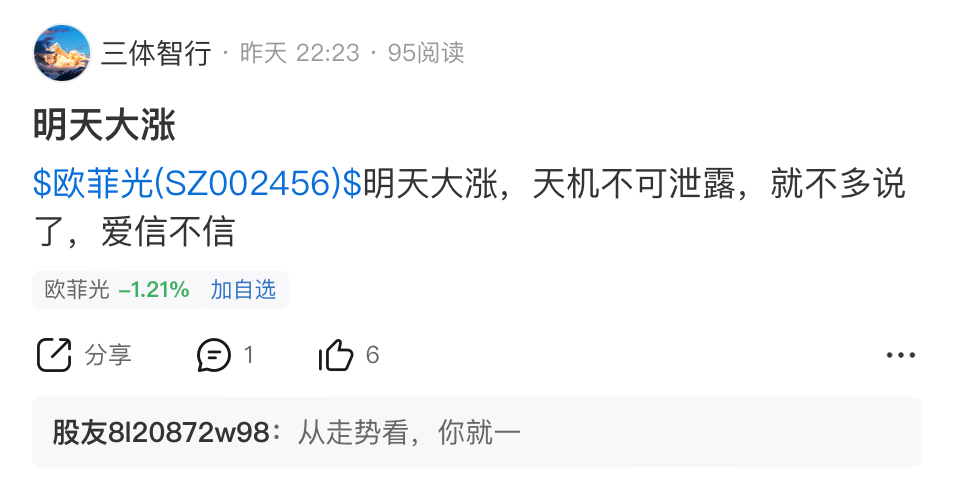 $欧菲光(SZ002456)$ 唱多遇到不少,下跌了气急败坏乱咬人的还是头一次见,还搞骂完就拉黑的懦夫行为