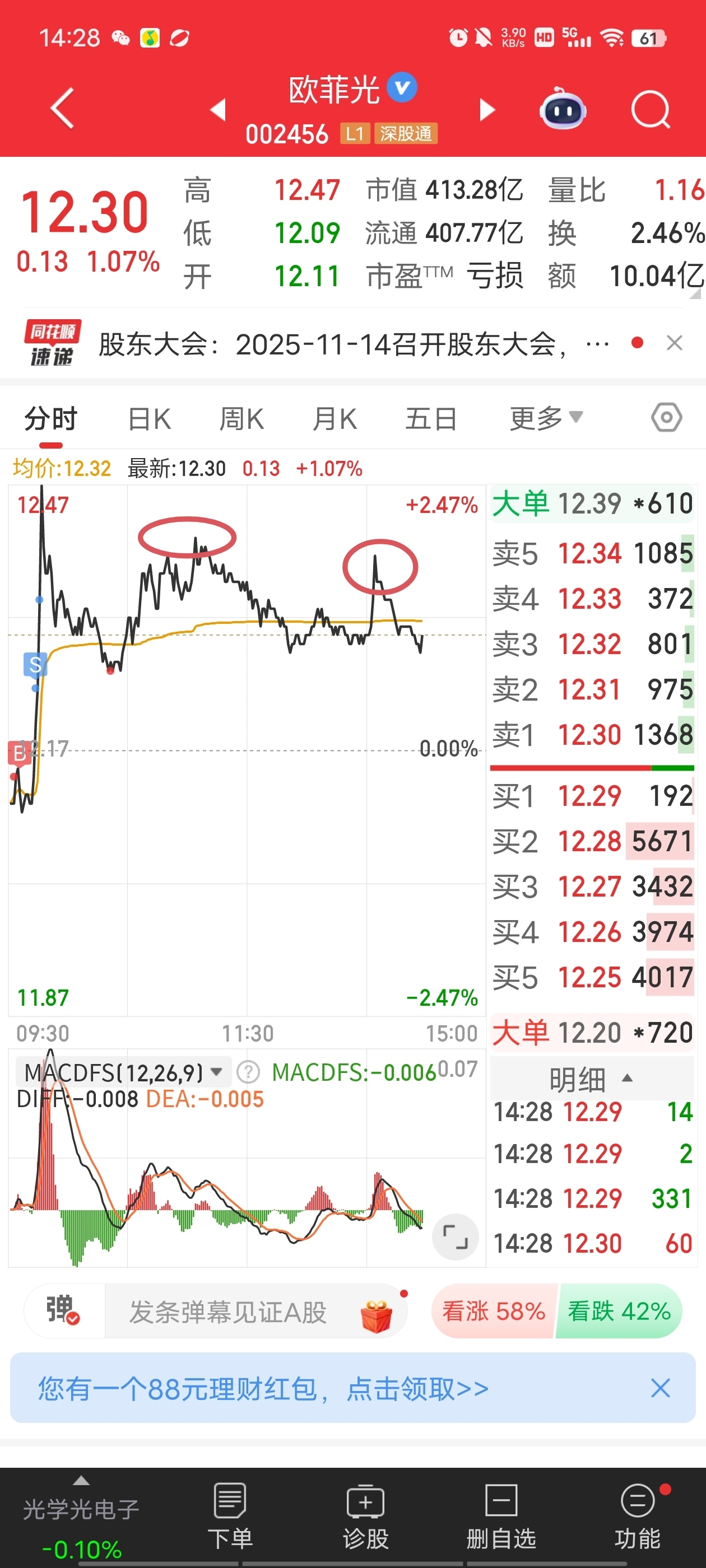 $欧菲光(SZ002456)$ 失败,给了两次机会没t,活该我亏钱。我真是个贪狗,总觉得今天会大涨三个点,一直格局