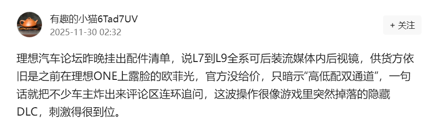 理想汽车论坛近日发布消息,L7至L9全系车型将支持后装流媒体内后视镜,供货方依旧是之前在理想ONE上露脸的欧菲光。官方虽未公布价格,但以“高低配双通道”的表述引发用户热议,不少车主在评论区展开追问。