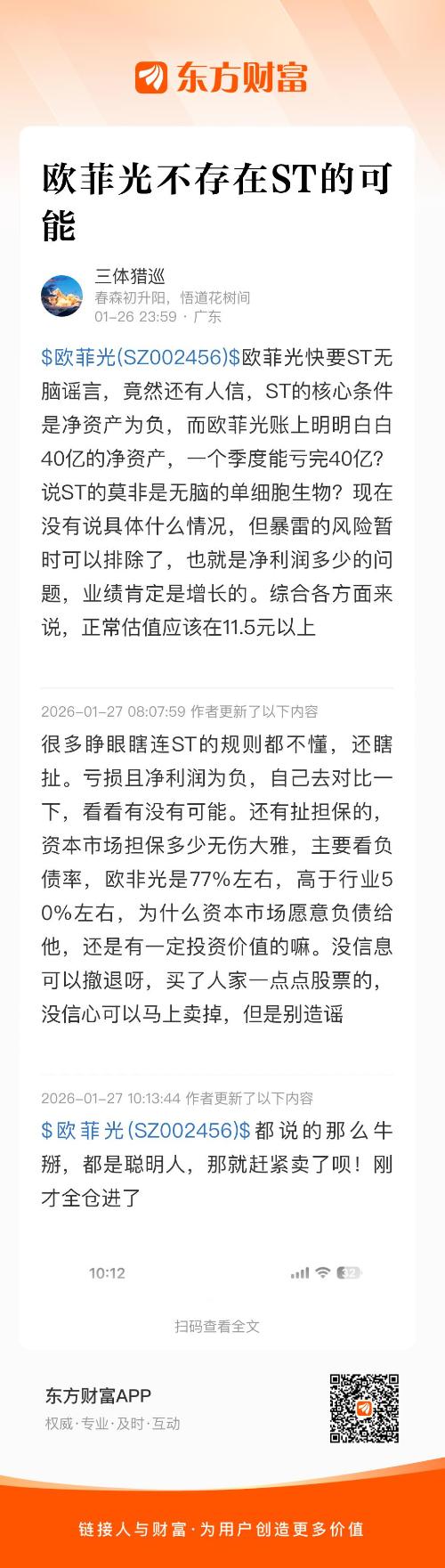 $欧菲光(SZ002456)$欧菲光快要ST无脑谣言,竟然还有人信,ST的核心条件是净资产为负,而欧菲光账上明明白白40亿的净资产,一个季度能亏完40亿?说ST的莫非是无脑的单细胞生物?现在没有说具体什么情况,但暴雷的风险暂时可以排除了,也就是净利润多少的问题,业绩肯定是增长的。综合各方面来说,正常估值应该在11.5元以上