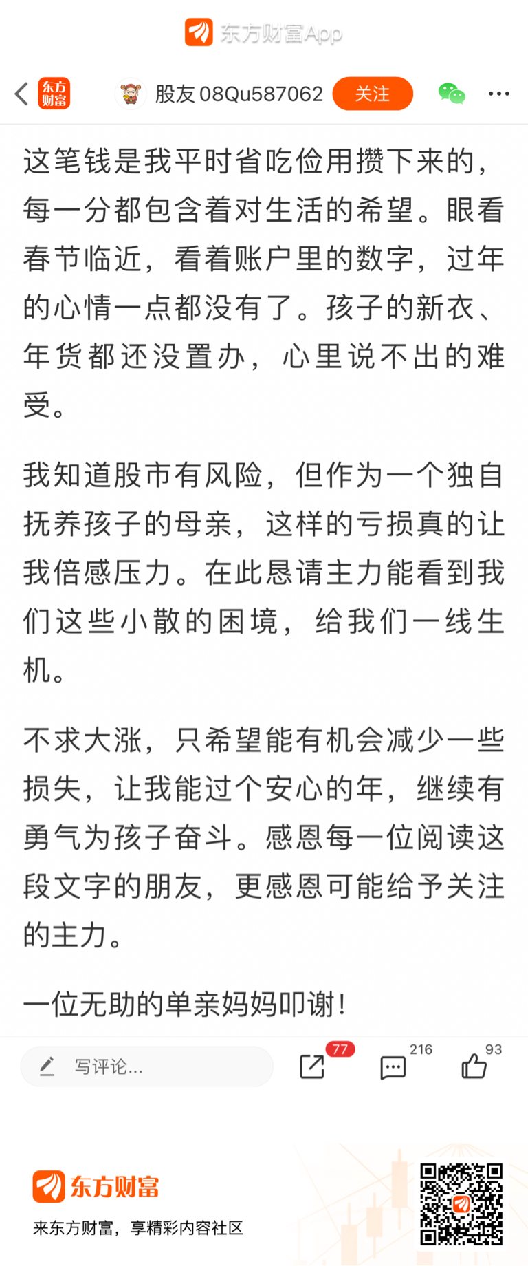 一位单亲妈妈把省吃俭用攒下的血汗钱投入欧菲光,本想给孩子多一份未来保障,却在股价持续下跌中被套牢。眼看春节临近,孩子的新衣、家里的年货都没着落,她只能含着泪写下这段话,恳请“主力”能给小散一线生机。