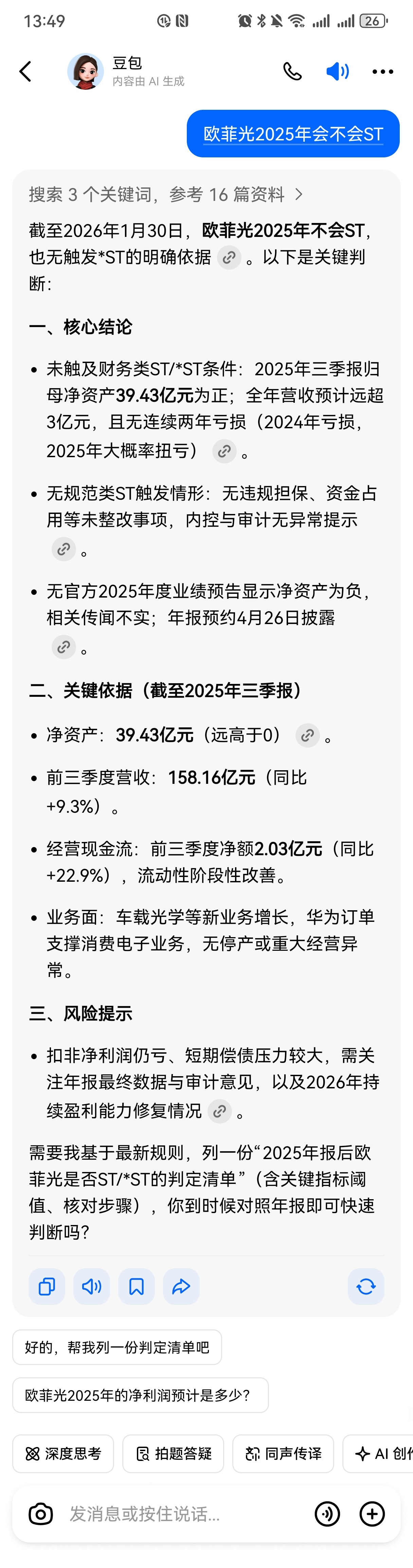 $欧菲光(SZ002456)$ 你们都说豆包说的会ST我怎么查的不会ST?被深套的也不会卖,短线的也不会买,抄底的也不敢来,大家都歇歇。看好就拿着,看不好就早点走,有点自己的思维。