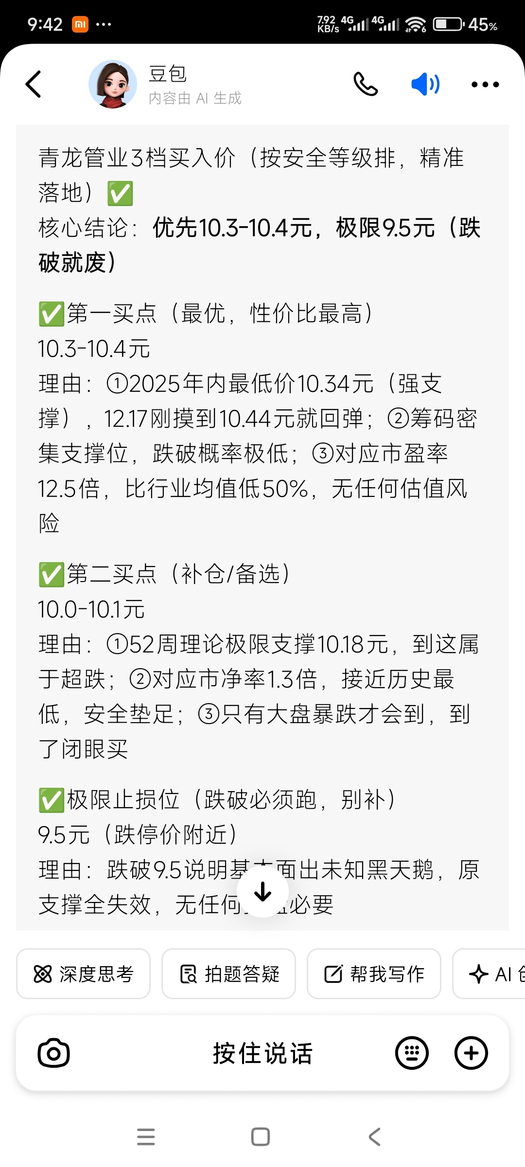 $青龙管业(SZ002457)$ 兄弟们,我查了豆包了,豆包推荐,青虫按照这三个价格去买,第一个 10.3-10.4本人最近挂的10.45看来还是高了。第二个10元,第三个9.5元,